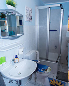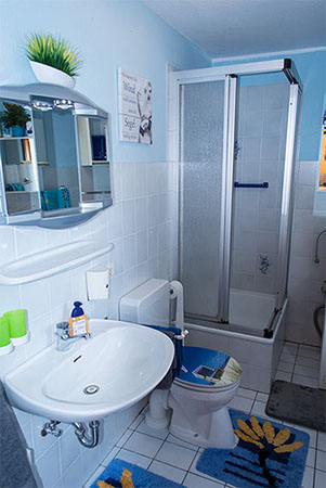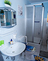 Das liebevoll dekorierte Bad mit Waschbecken, Dusche u. WC.